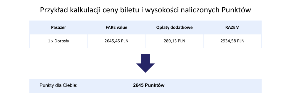 Liczba punktów, jakie otrzymasz w programie, jest równa wartości taryfy za sprzedany i zrealizowany bilet. Co to oznacza? Za zrealizowaną złotówkę z rejsów objętej punktacją, w klasie której zarezerwujesz bilet z siatki LOT, otrzymujesz 1 punkt.